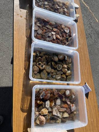 Have several different agates, mostly cut, for sale. Malawis, Condors, Thundereggs, Berrendos, Brazilians, Morocco, Turkish, Fairburns. Probably more, just ask I probably have it. Can check out the collection. Also, severl tumbled specimens and rocks ready to be tumbled, by the pound. Lots of local Utah agate/jasper as well.