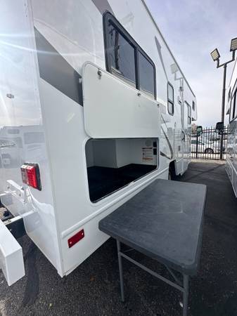 Quick Notes: Free powertrain warranty included, NEW gelcoat exterior, generator tune-up, excellent tires, all fluids changed, full-size spare tire, full roof resealed, clean commercial quality upholstery, water-resistant composite roofing, removable outdoor picnic table, huge basement storage, chemical-free winterization, central heating, solar battery charger ready, all wood oak cabinets, Class III hitch w/ Tow/Haul.